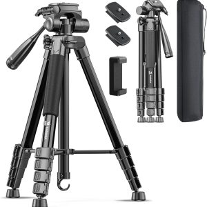 73″ Camera Tripod Stand, Aluminum Tripod with Phone Holder, Travel Bag, Compatible with GoPro/DSLR/Cell Phone/Camcorder, Max Load 8.8LB (Black)